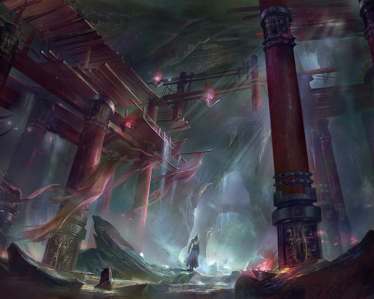 We passed through a strange roundish portal below the warning sign, it looked as if beyond there was more cavern, but upon passing through it we found it an illusion, for we were in some kind of abandoned entry chamber, a place meant long ago to impress visitors, but now aged and neglected for who knows how long. There was a now dry reflecting pool, its bottom now stained by rust and mold that dominated the center of the chamber. A tall, circular brass door, closed with a masterful locking mechanism at its center, stood at the end of a short recessed entryway with marble floors just beyond the pool. Two statues, life sized female wizards, flanked the door, difficult to see at first because they themselves stood recessed in alcoves to either side of the fine brass portal, which was the only thing in the room that seemed to shine like it did when it was first made.
